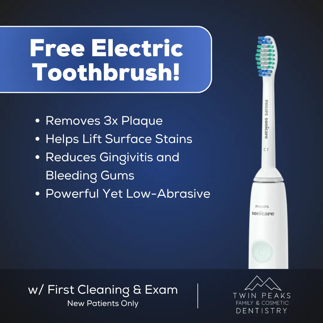 That’s why with your first cleaning appointment, I’m giving you a brand-new Electric Toothbrush… a simple gift to help keep your teeth healthy, strong, and problem-free.